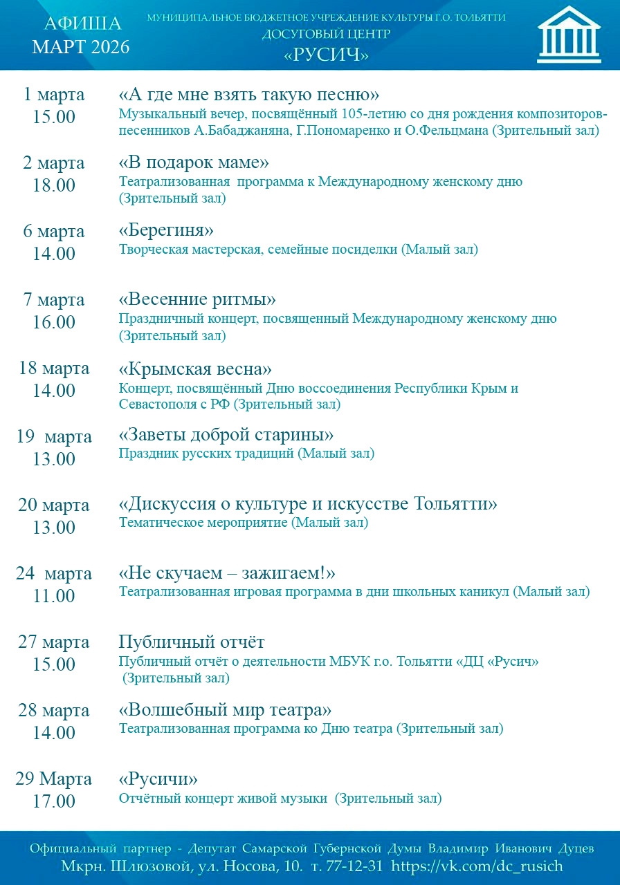 © МУНИЦИПАЛЬНОЕ БЮДЖЕТНОЕ УЧРЕЖДЕНИЕ КУЛЬТУРЫ ГОРОДСКОГО ОКРУГА ТОЛЬЯТТИ "ДОСУГОВЫЙ ЦЕНТР "РУСИЧ" совместно с Проектом Росшкола - № 1 по сайтам образовательных организаций и учреждений культуры. Пользовательское соглашение и Политика конфиденциальности. Копирайт © 2018 МБУК г.о.Тольятти "ДЦ"Русич". Все права защищены.